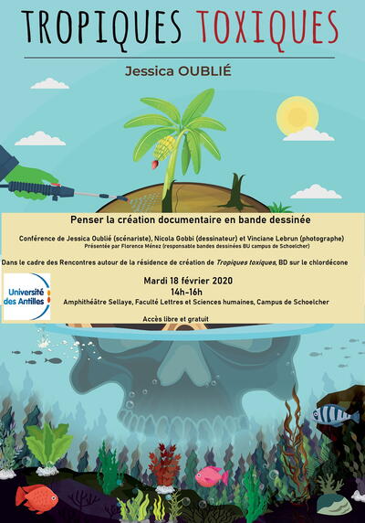 Durant leur résidence de création en Martinique (12 au 19 février 2020), Jessica OUBLIÉ, scénariste, Nicola GOBBI, dessinateur, Vinciane LEBRUN, photographe, tous trois auteurs de Tropiques toxiques, (Steinkis, octobre 2020), bande dessinée documentaire sur le chlordécone, rencontreront le public pour partager avec lui l'avancée de leurs travaux.